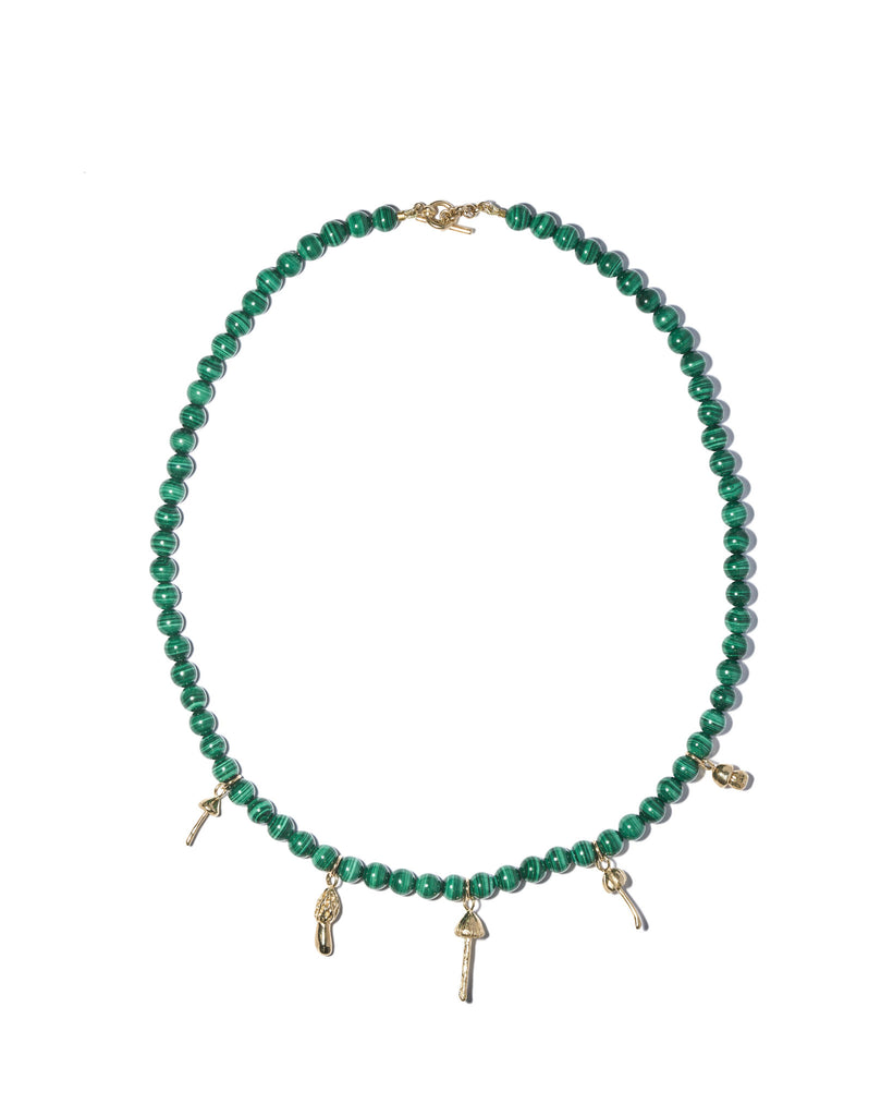 Paddenstoelenketting van malachiet met 9 karaat paddenstoelen en handgemaakt slot.