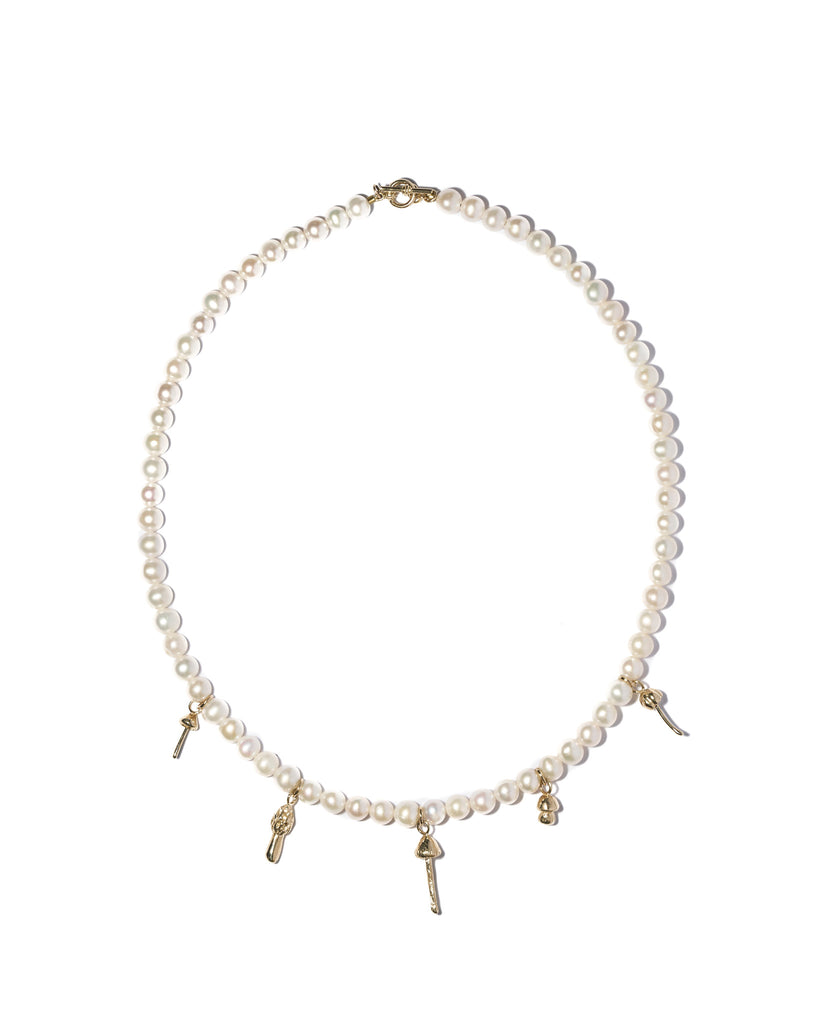 Get your nature-loving glam on and make a statement with this killer necklace! Made of fresh water pearls and goldie mushrooms.