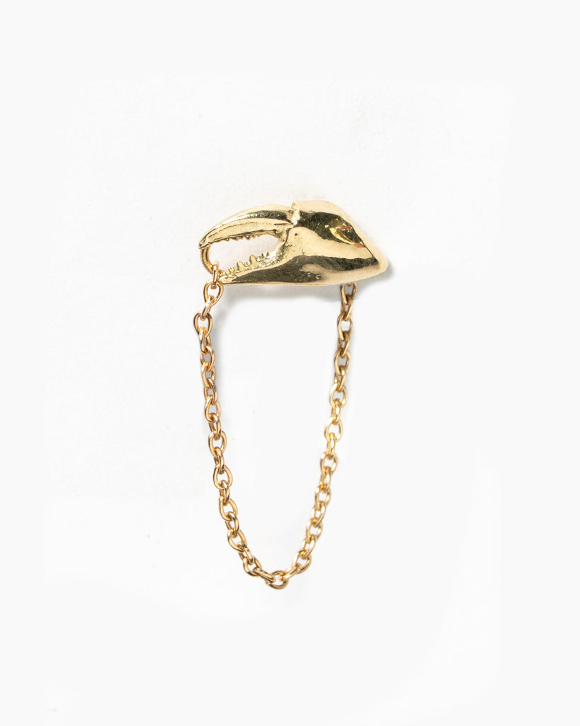 Enkele oorsteker krabbenpootje van 14k goud met gouden kettinkje die achterlangs het oor gaat.