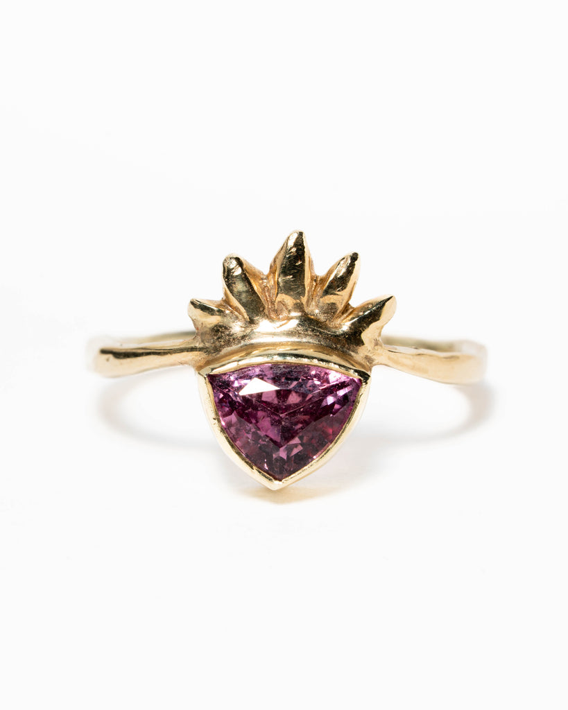 Ring Jane is gemaakt van 14k geelgoud met een triangle cut rode saffier van 1.17 caraat. Het is een enkelstuk in maat 17 mm. Maar kan op aanvraag vergroot of verkleind worden.
