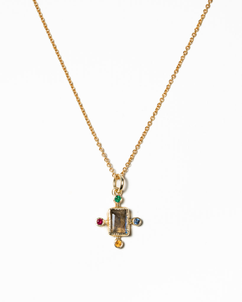 Unieke hanger gemaakt van 14 karaat geelgoud met een labradoriet met daar omheen smaragd, saffier, citrien en robijn. De afmetingen zijn 15,2 mm x 12,3 mm. De prijs is exclusief ketting.