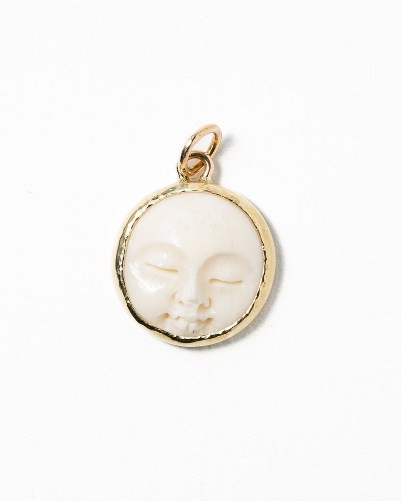 Hanger gemaakt van 14 karaat geelgoud met een gezichtje van been. Doorsnee van de hanger is 16 mm.