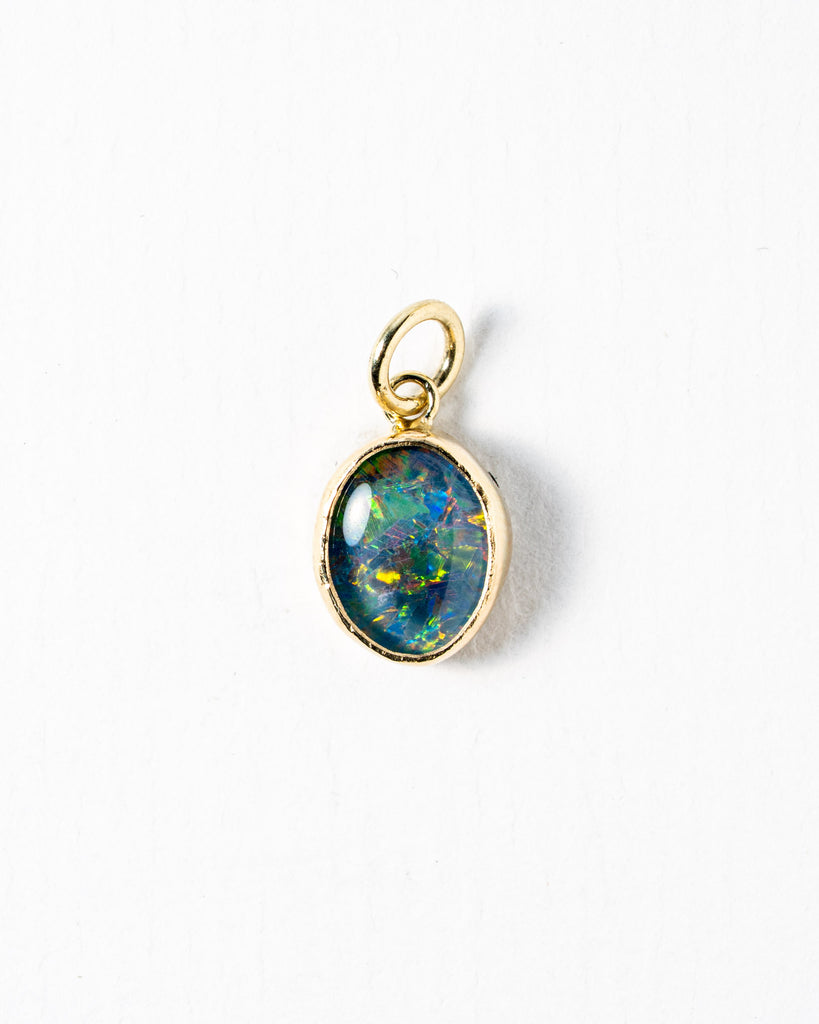 Hangertje gemaakt van 14k geelgoud met een triplet opaal. Afmetingen steen met zetkast: 9.8 x 8.3mm. Lengte van hanger met hang oog: 16mm.
