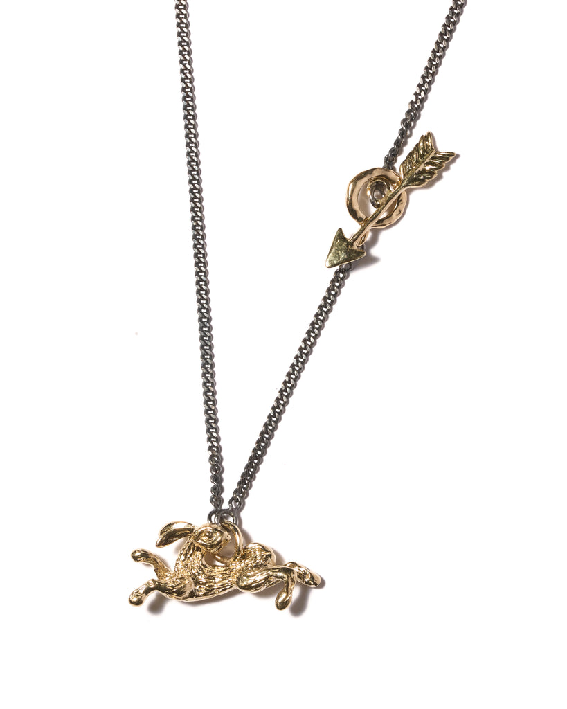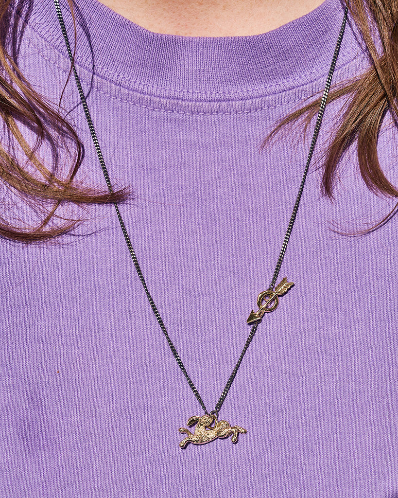 Spirit animal Haas gemaakt van 9 karaat. Als losse hanger verkrijgbaar of aan een zilver geoxideerde ketting met een pijl slot ook van 9 karaat.