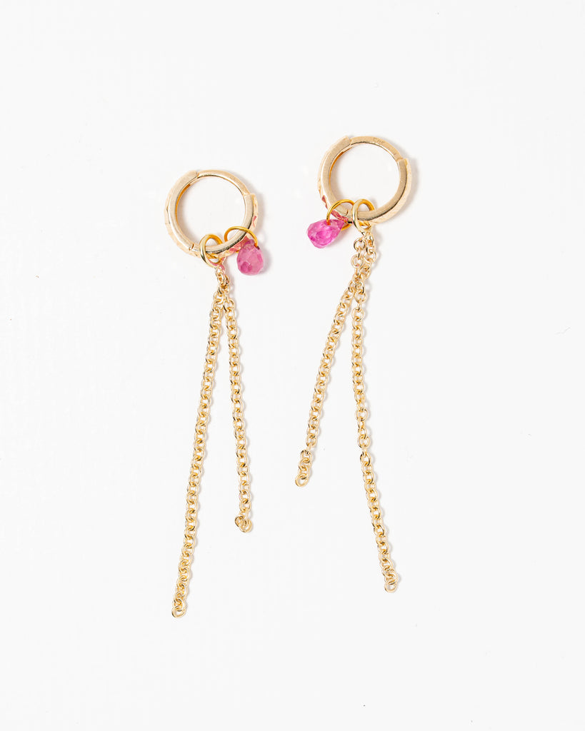 Gouden huggie oorbellen gemaakt van 14k geelgoud met roze saffier druppels en gouden kettinkjes.