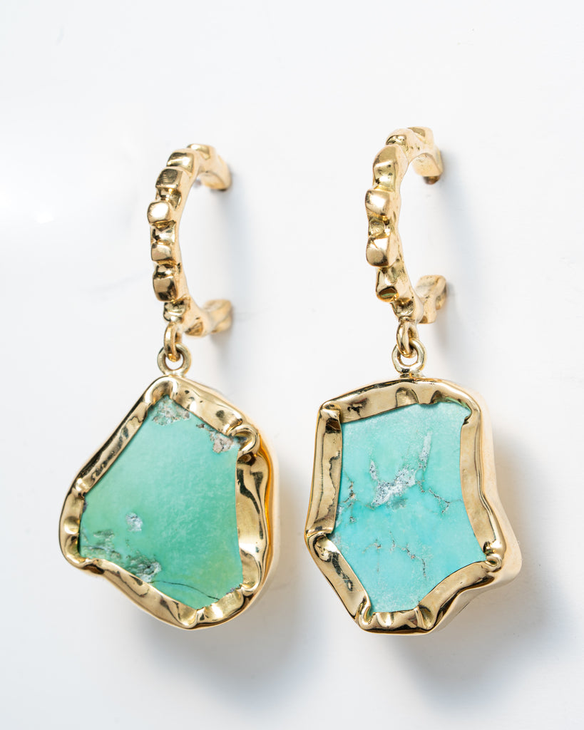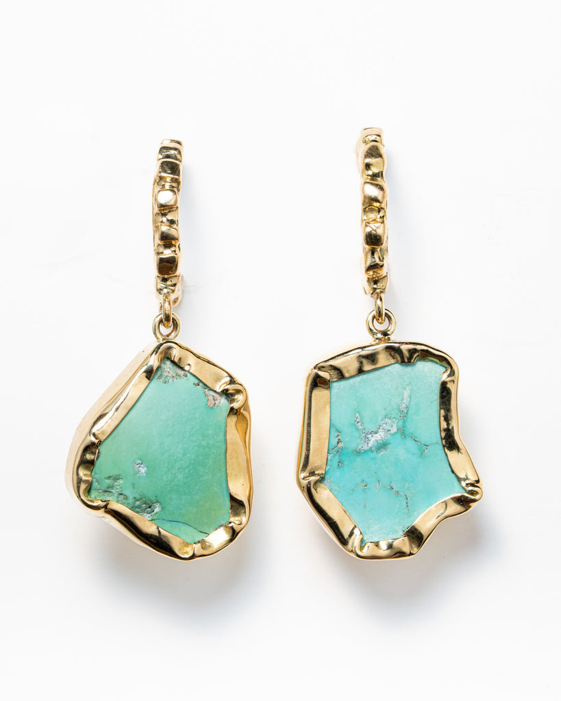 One of a kind oorsieraden met turkoois plakjes gezet in 18 karaat. De turkoois hangers hebben een dichte achterkant en ze bungelen aan mooie bewerkte creolen. De totale lengte is ± 40 mm. De breedte van de plakjes is ± 17 mm.