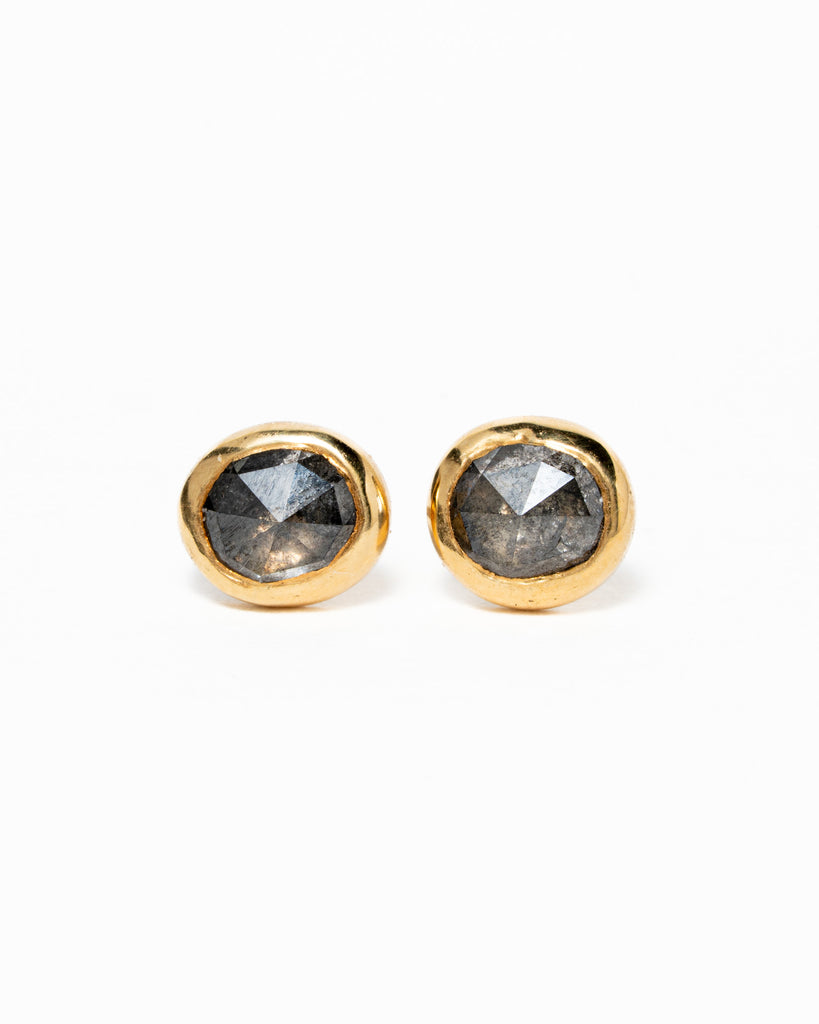 Oorstekers met ovale roos geslepen salt & pepper diamanten van in totaal 1.94 caraat. De zettingen en achterkant zijn gemaakt van 18krt geelgoud. De poussettes zijn van 14krt geelgoud. Salt & Pepper diamanten zijn geliefd onder sieraden designers. Het betreft een uniek paartje. De maat van de oorstekers is 7,5  x 6,2 mm.