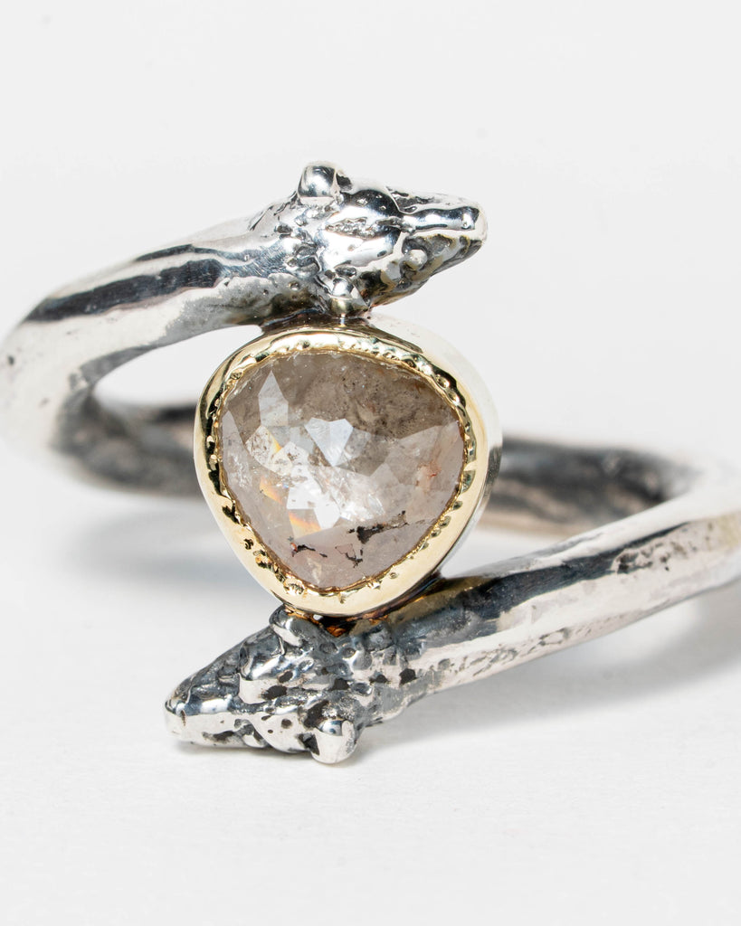 One of a kind berenring gemaakt van zilver met een bruine roos geslepen diamant van 1.51 caraat in 14k geelgoud gezet. Valt als ringmaat 18,25 mm.