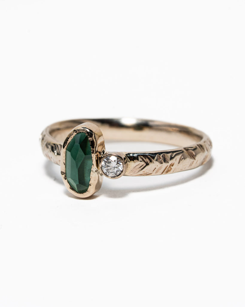 One of a kind 14k champagnegouden ring met v-motief met een groene roos geslepen toermalijn en een witte H-si diamant