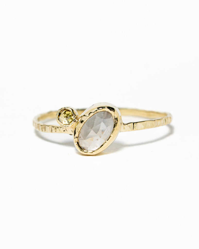 Fijne ring gemaakt van 14k geelgoud met een grijze roos geslepen saffier van 0.75 caraat en een olive green diamantje van 0.02 caraat.