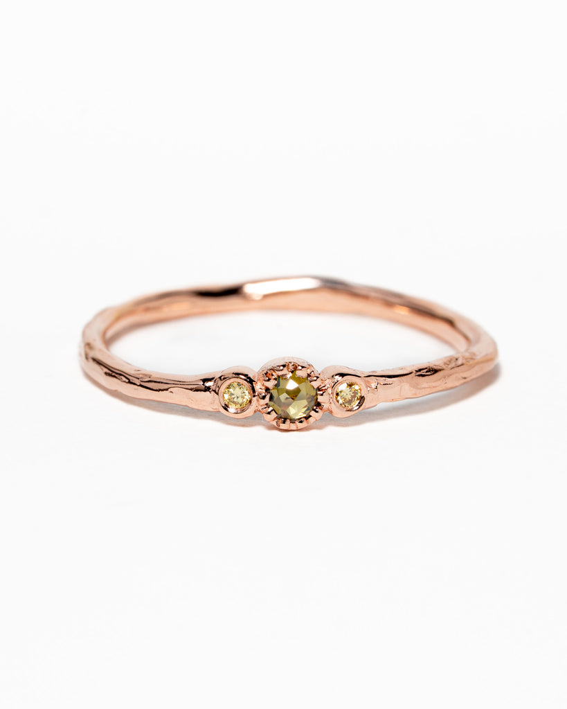 Fijne ring Minnie van 14k roodgoud met een olive green rose cut diamantje in het midden en twee fancy yellow diamantjes van 0.01 caraat ernaast.