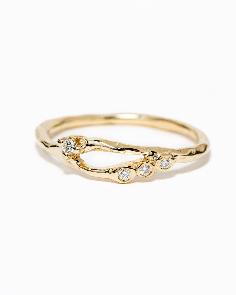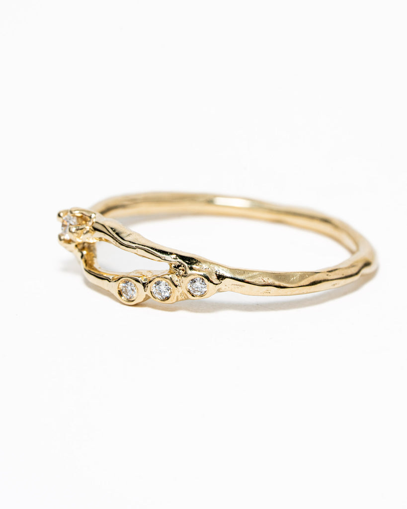 Ring Ava gemaakt van 14k geelgoud met 3x F-vvs diamantjes van in totaal 0.08ct en 1x een D-vvs diamantje van 0.03ct.