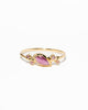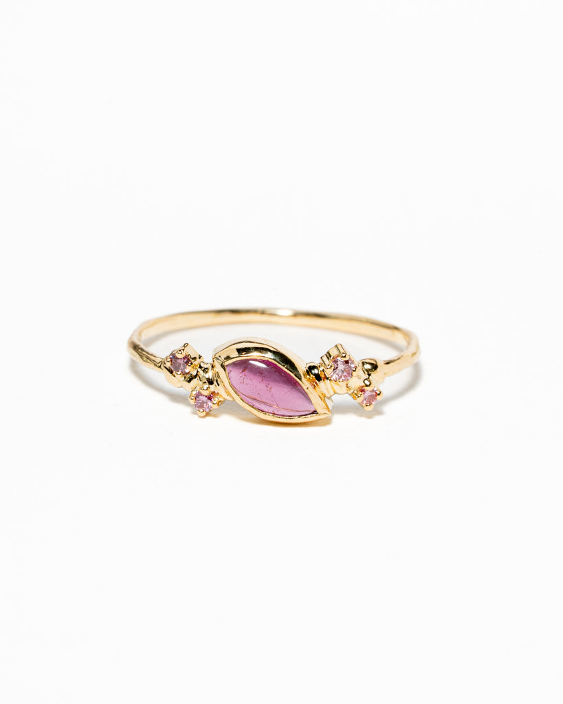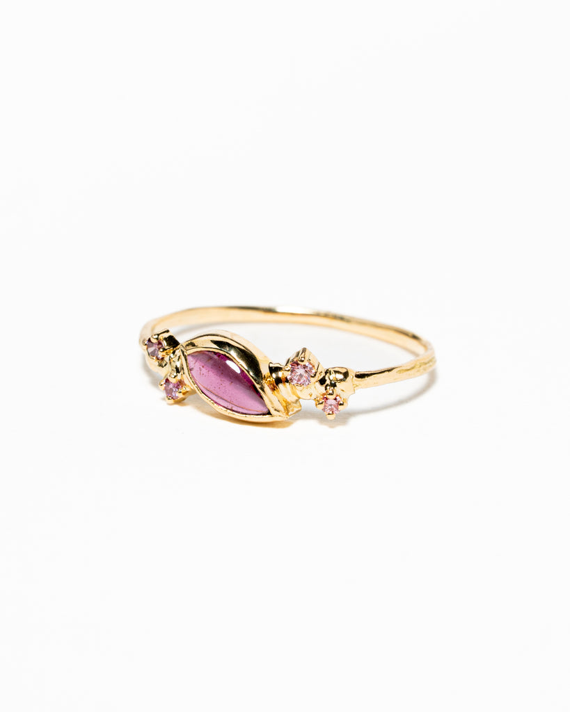 Ring Barbie gemaakt van 18 karaat geelgoud met een markies geslepen granaat en vier roze diamanten van in totaal 0.07 caraat. One of a kind snoepig ringetje.