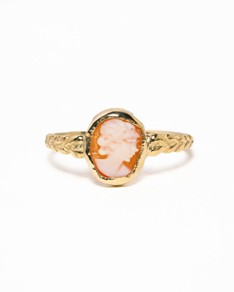 14k geelgouden ring met een klassieke schelpcamee maar dan in een modern jasje.