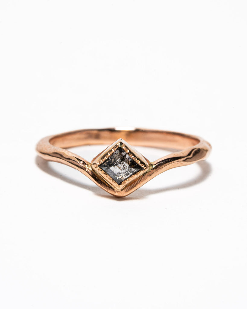 Fijne ring van 14k roodgoud met een salt & pepper kite diamant van 0.34 caraat. Enkelstuk.
