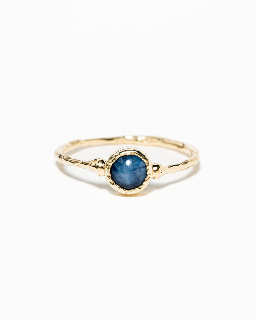 Lief ringetje gemaakt van 14 karaat geelgoud met een cabochon geslepen ster saffier. Dit is een enkelstuk.