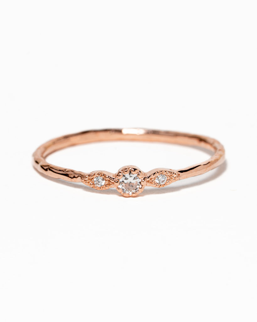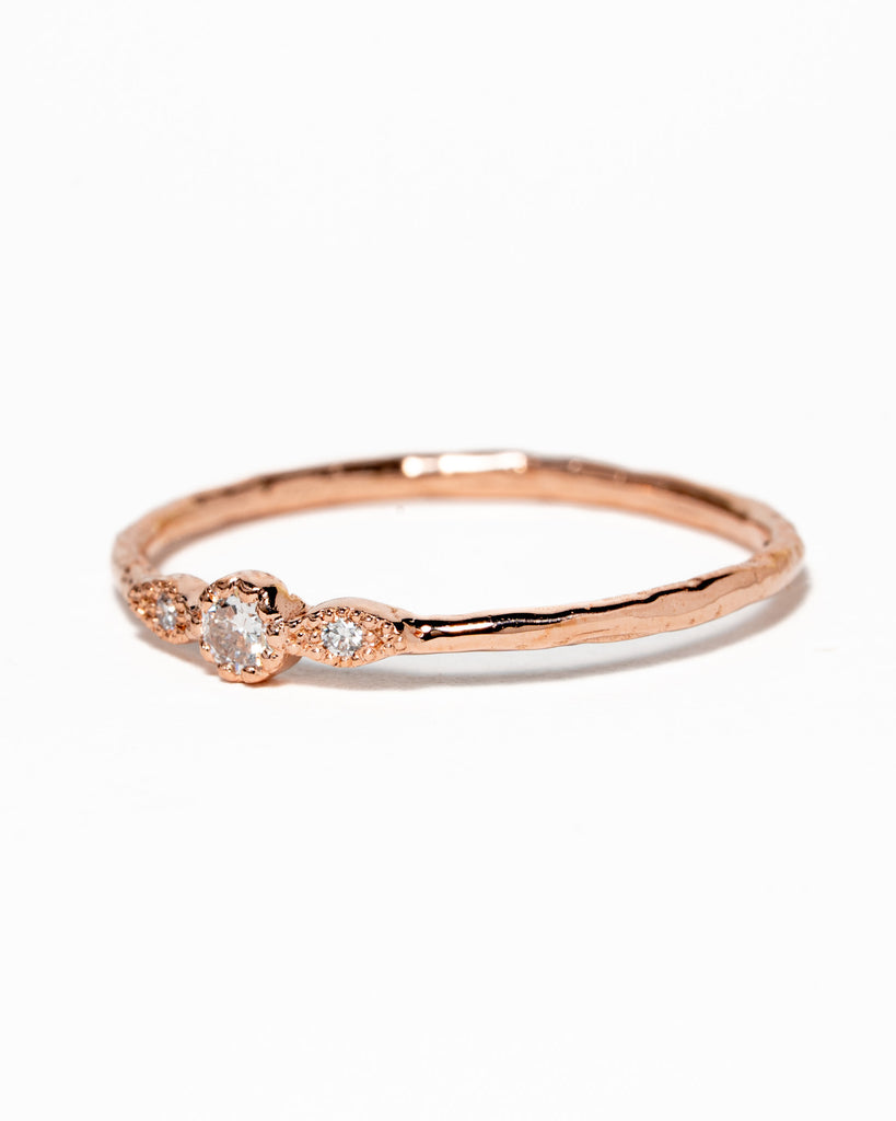 Fijne 14k roodgouden ring Ella met een witte diamant van 0.07 caraat in het midden en twee H-si diamantjes ernaast.