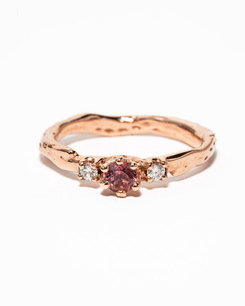 Ring Loulou van 14k roodgoud met een warm oranjeroze spinel van 0.29 caraat en twee witte H-si diamanten van 0.08 caraat in totaal. Een snoepje! De ring is een enkelstuk.