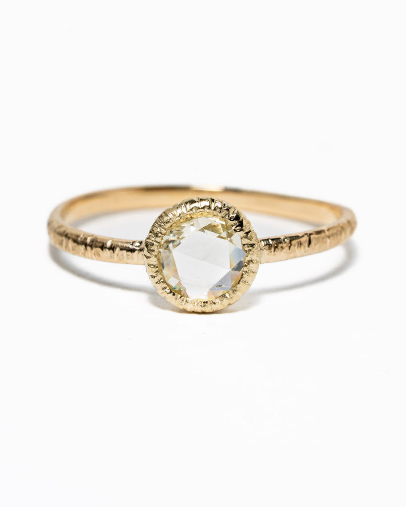 Stoere ring in 14k geelgoud met een antieke roos diamant van 0.41ct in gladomzetting gezet. De antieke diamanten waar wij veel mee werken zijn gered uit oude sieraden die inmiddels zijn omgesmolten. Roos geslepen diamanten hebben een subtiele zachtere uitstraling dan briljant geslepen diamanten.