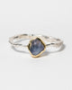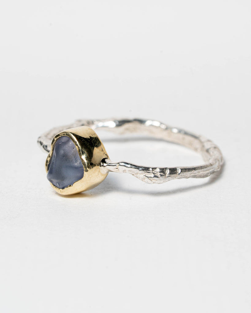 One of a kind zilveren grillige ring met een ruwe saffier in 14k geelgoud gezet.
