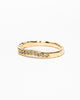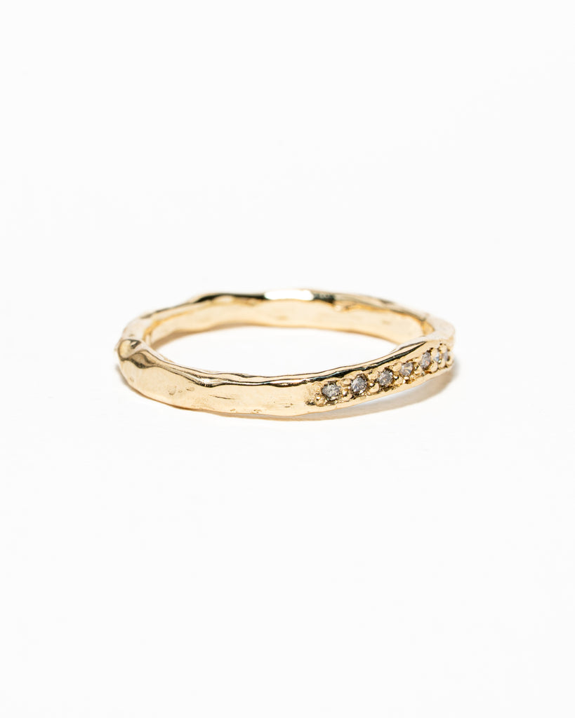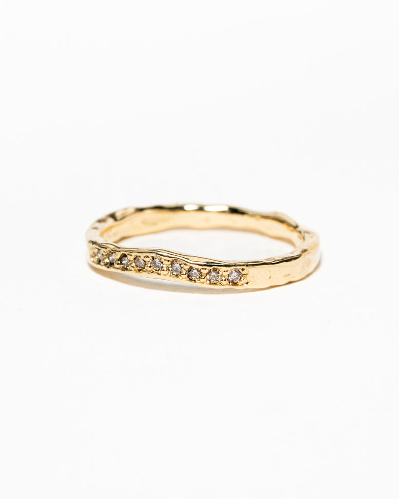 De grillige aanschuif ring, maar dit keer met een bochtje. Gemaakt van 14 karaat geelgoud met negen light brown diamanten van in totaal 0.09 caraat. Dit is een uniek stuk, prefect als trouwring naast een verlovingsring.