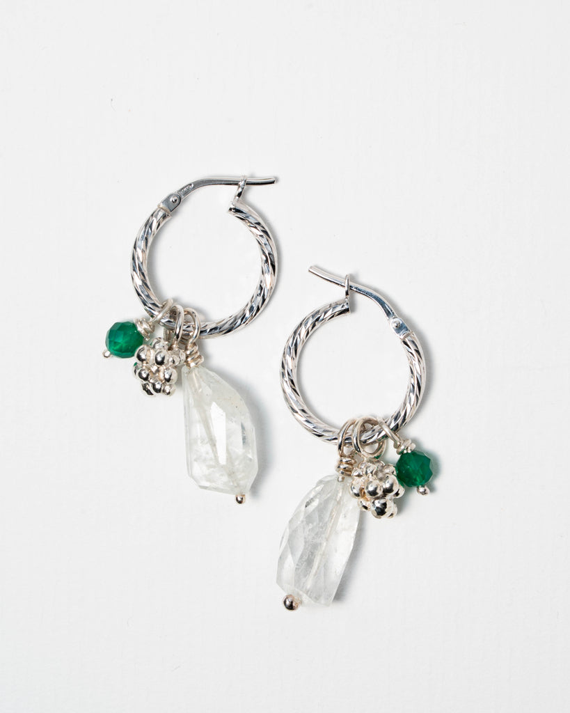 Zilveren oorringen met groen chalcedoon en aquamarijn en berries. De oorringen hebben een diameter van 14 mm.