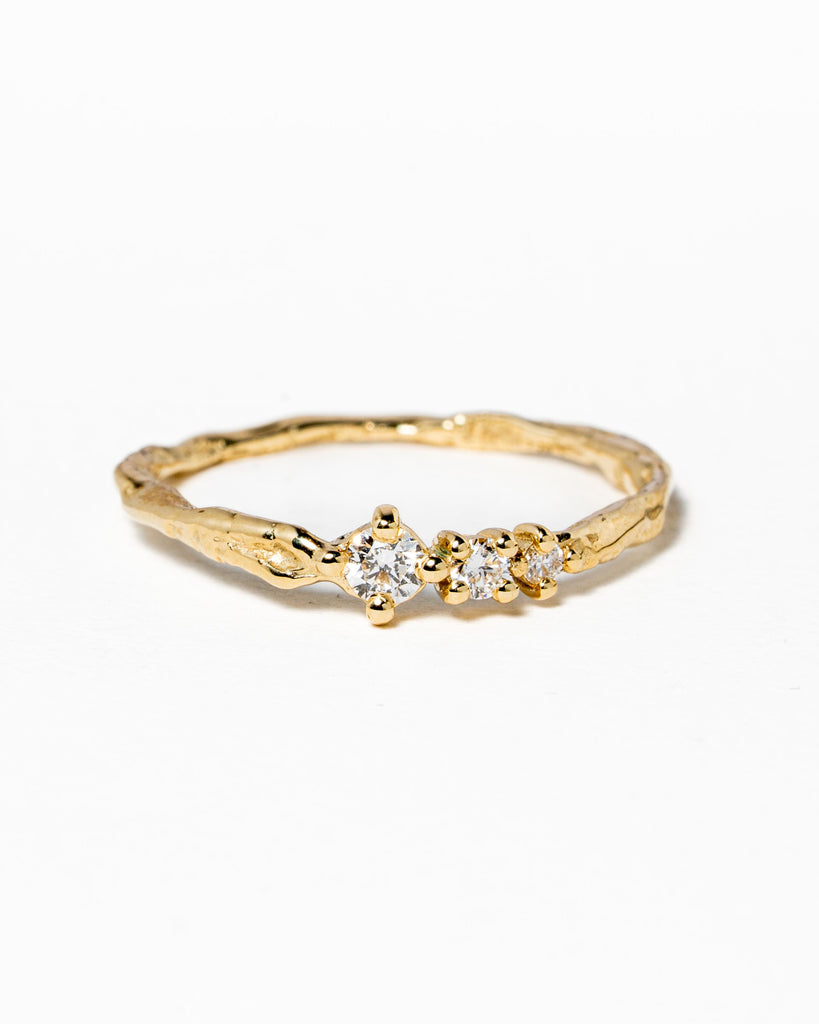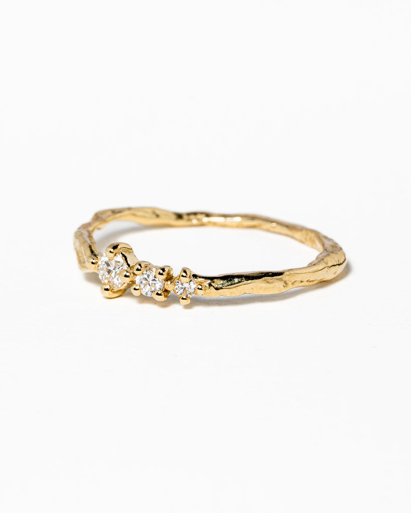 Feeny ring gemaakt van 14k geelgoud met een grote F-vvs diamant en 2 FG-si diamanten van in totaal 0.21 caraat. Mooi grillig en verfijnd.