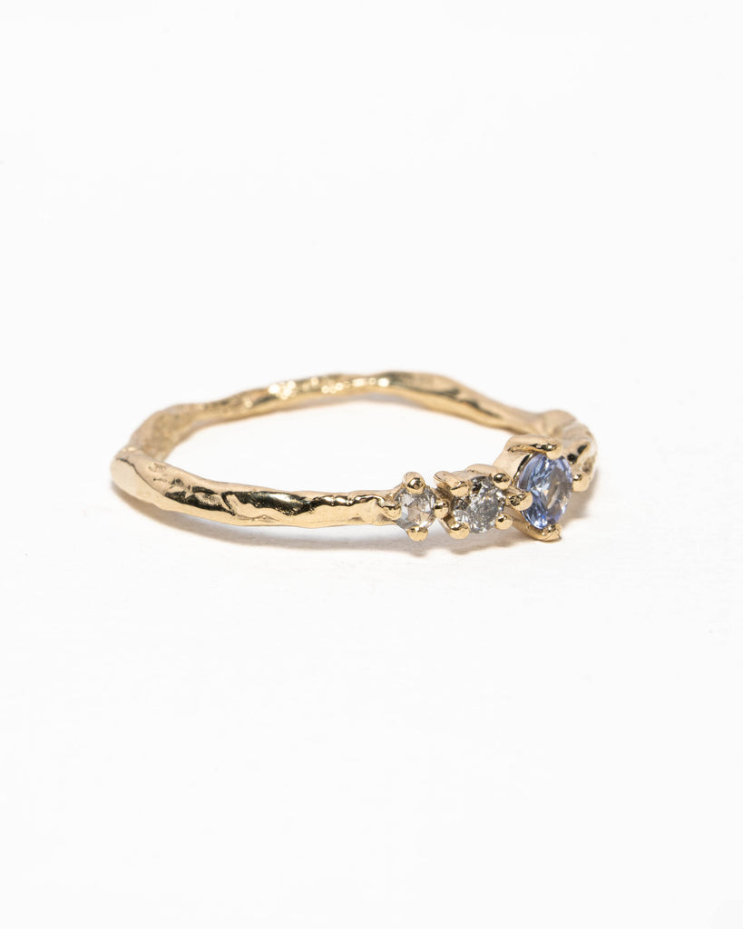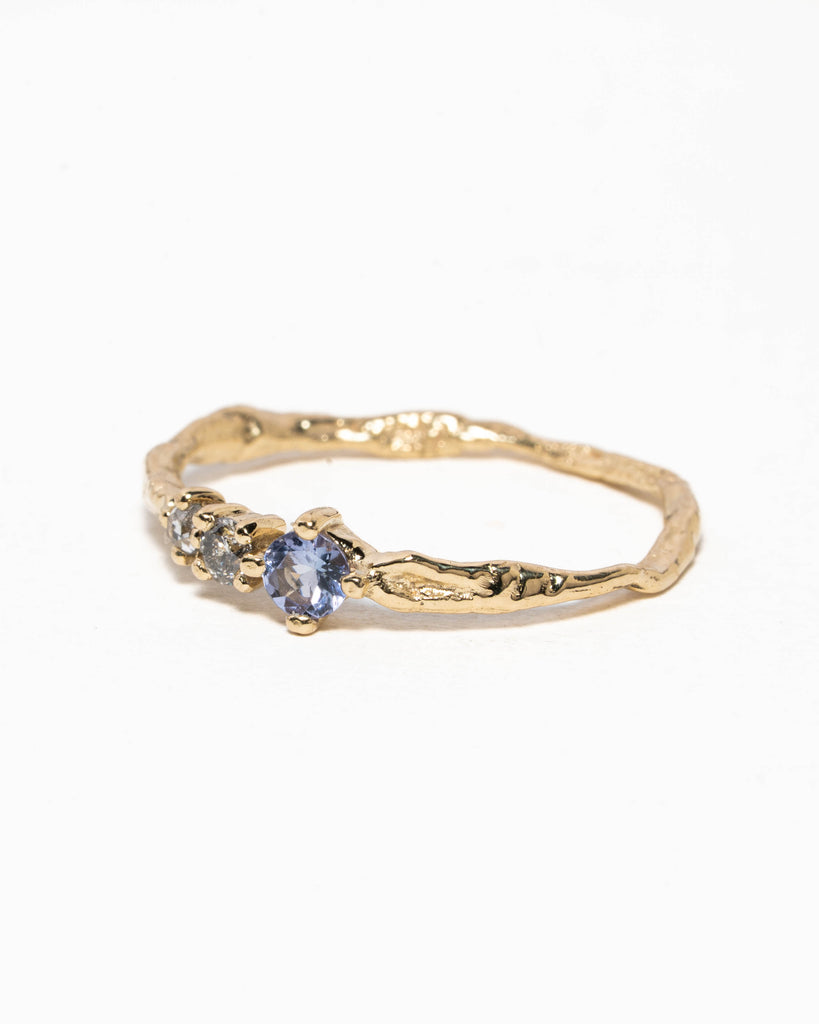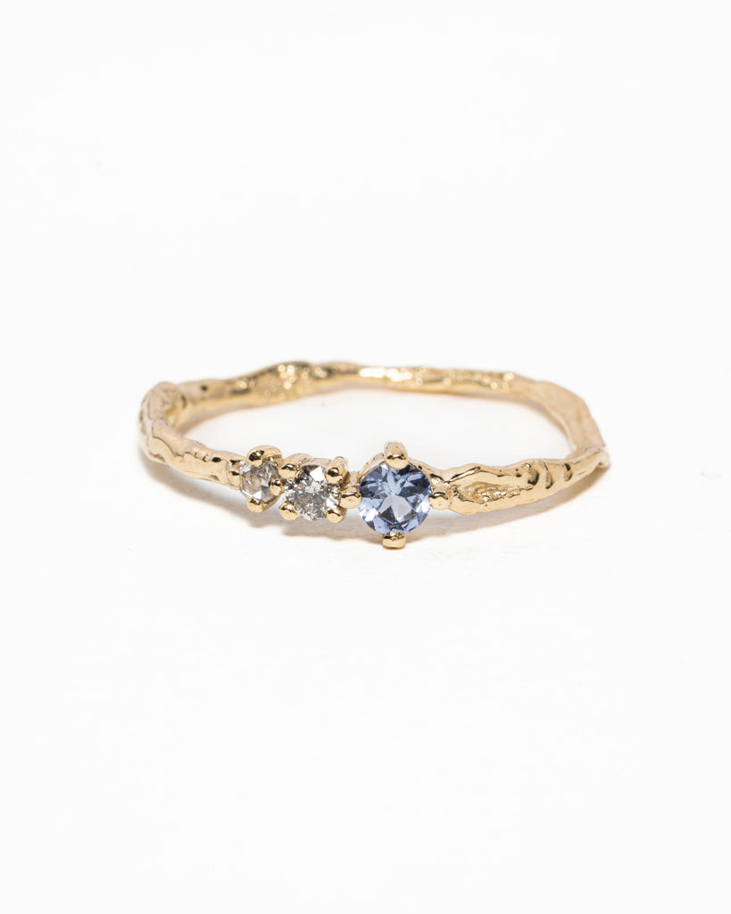 Feeny ring gemaakt van 14k geelgoud met lichtblauw tanzanietje en twee salt and pepper diamantjes. Mooi grillig en verfijnd.