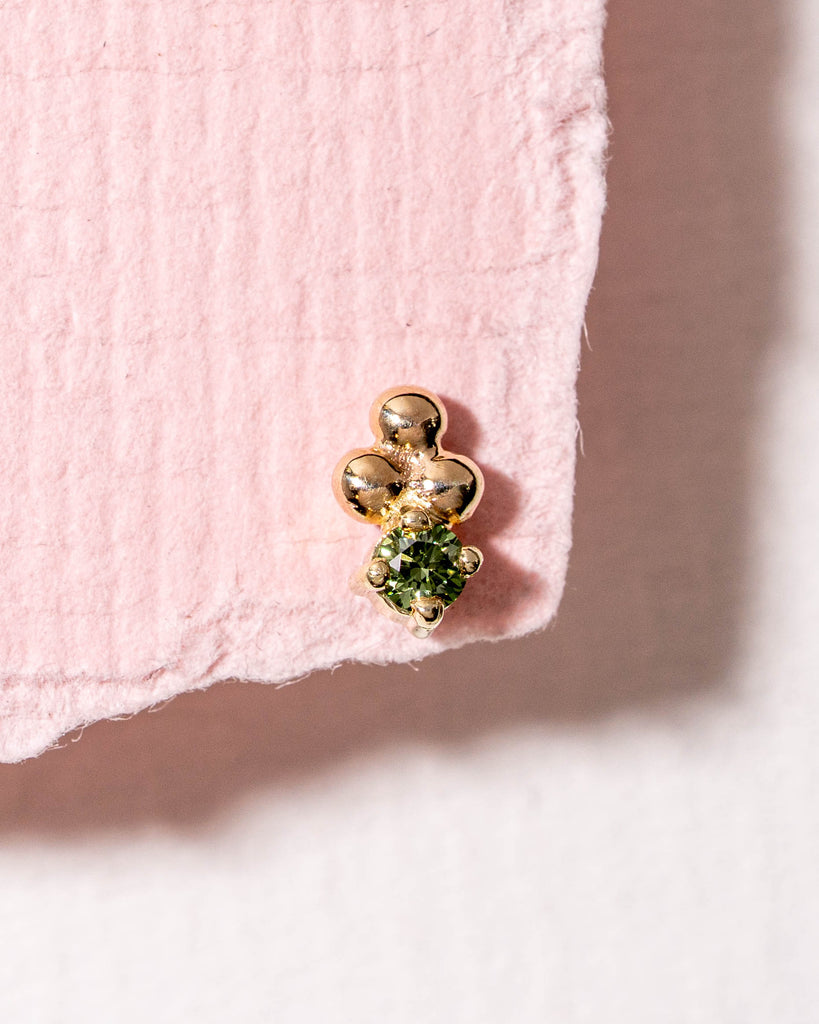One of a kind flatback piercing met een mintgroene diamant van 0,03 caraat 3 gouden bolletjes. Afmeting ± 3,4 x 5,7 mm diameter.