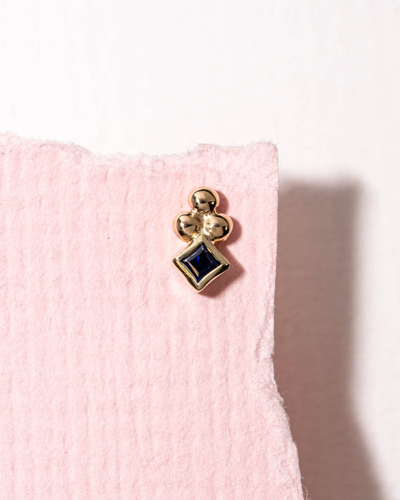 One of a kind flatback piercing met een carré saffier en 3 gouden bolletjes. Afmeting ± 3,3 x 6 mm diameter.
