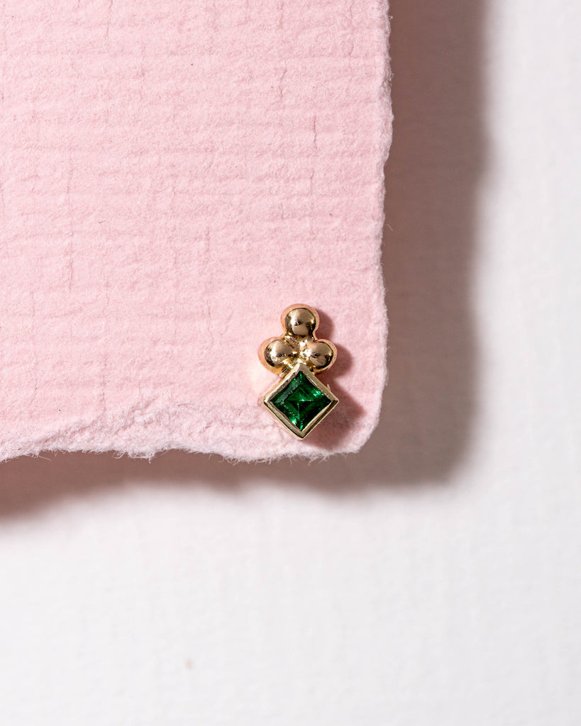 One of a kind flatback piercing met een carré smaragd en 3 gouden bolletjes. Afmeting ± 3,3 x 6 mm diameter.