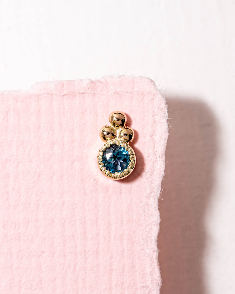 One of a kind flatback piercing met een blauwe topaas en 3 gouden bolletjes. Afmeting ± 3,7 x 6,6 mm diameter.