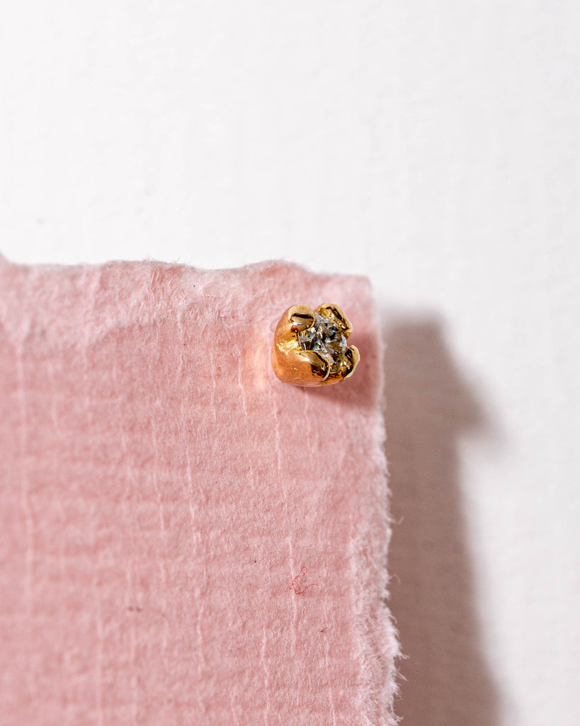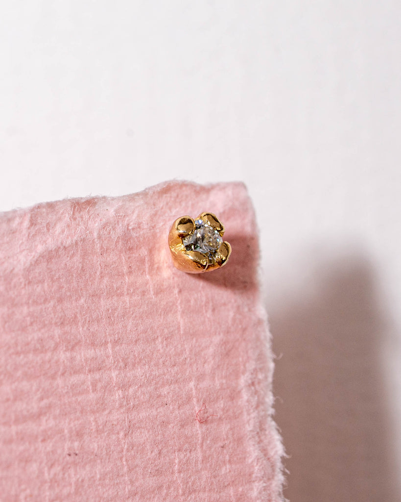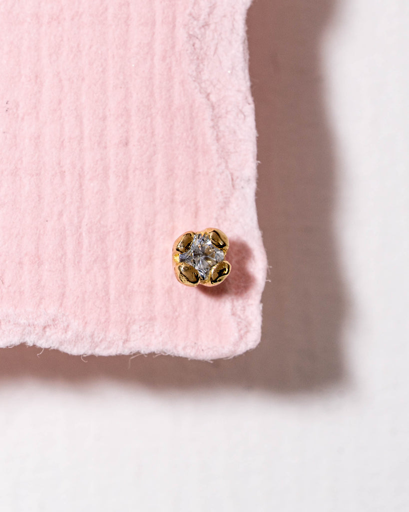 One of a kind flatback piercing met een witte F-vvs diamant van 0,03 caraat in 18k gouden zetting. Afmeting ± 3 mm diameter.