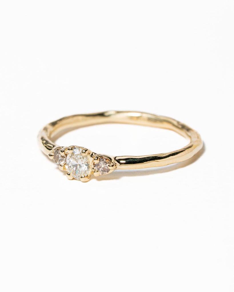 Elegante verlovingsring Amber gemaakt van 14 karaat geelgoud met een ovale witte GH-vs diamant van 0.16 caraat en twee light brown diamanten van in totaal 0.08 caraat.