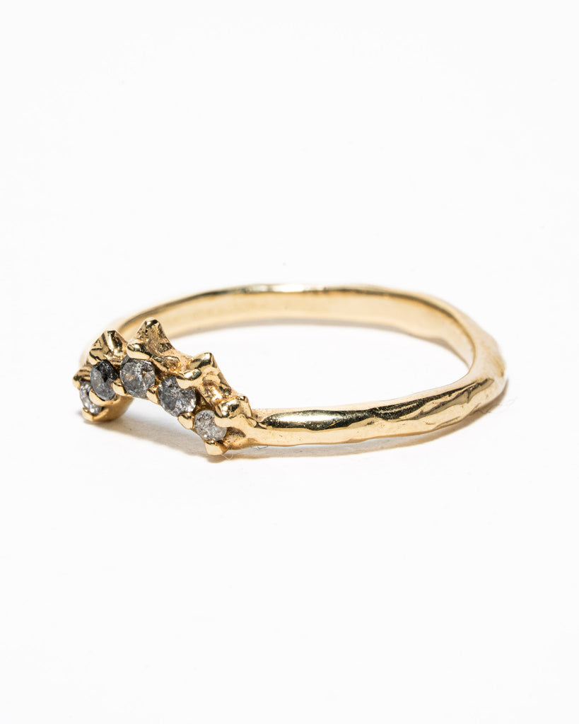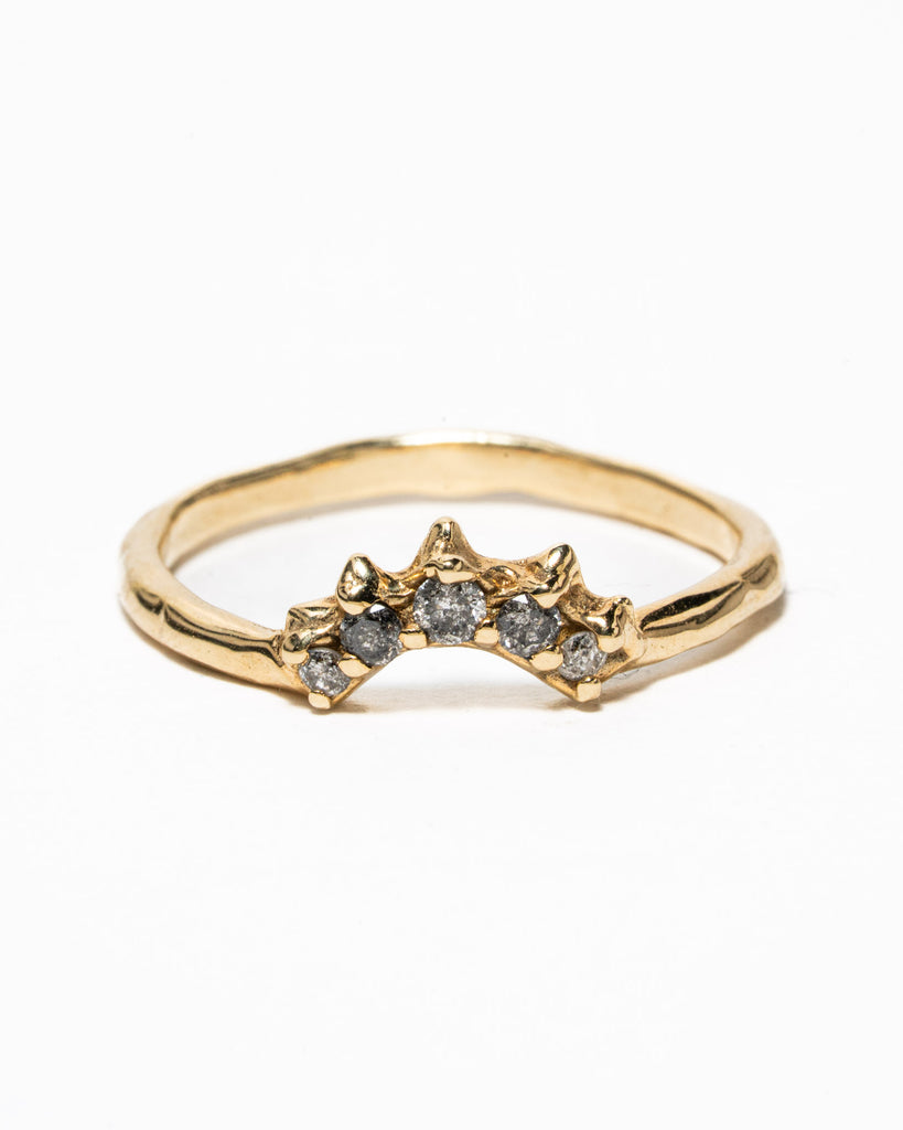 Ring Evelyn is een robuustere versie van onze klassieke diamanten stackingring. Gemaakt van 14krt geelgoud met 5 salt & pepper diamantjes van in totaal 0.14 caraat.