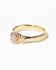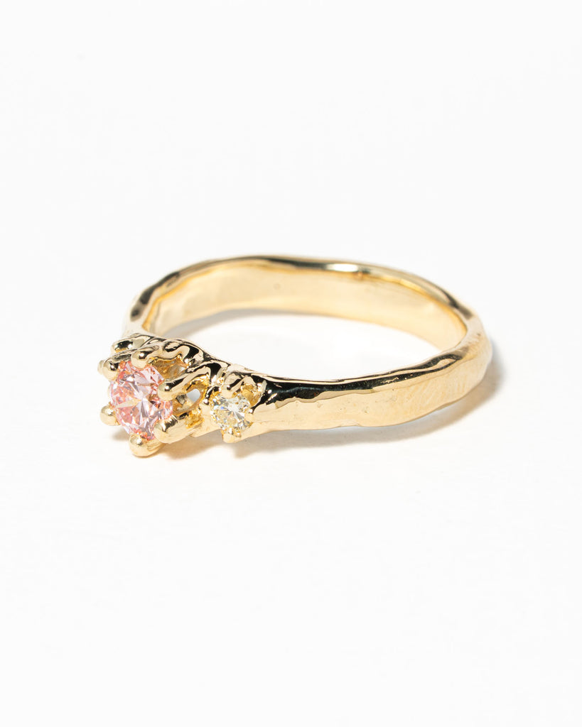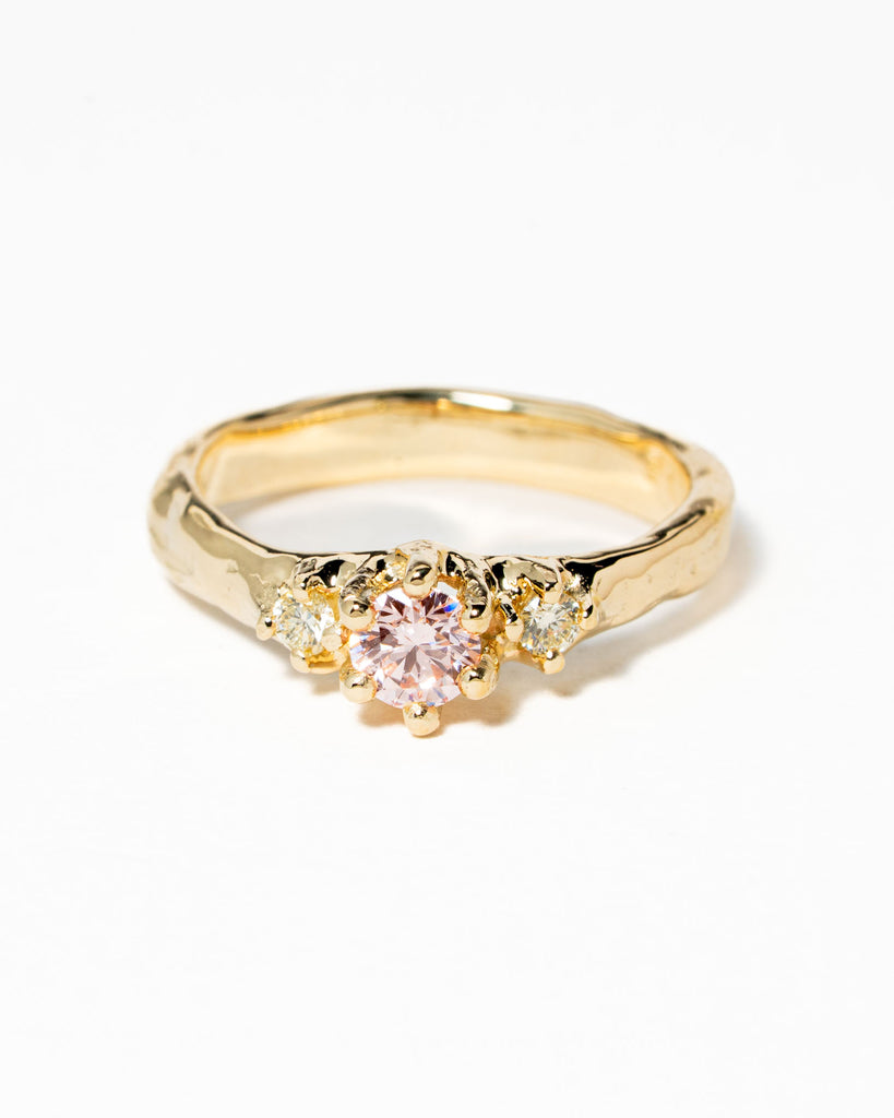 Robuuste verlovingsring Odile gemaakt van 14 karaat geelgoud met een baby pink diamant van 0.32 caraat en twee cape diamanten van in totaal 0.10 caraat.