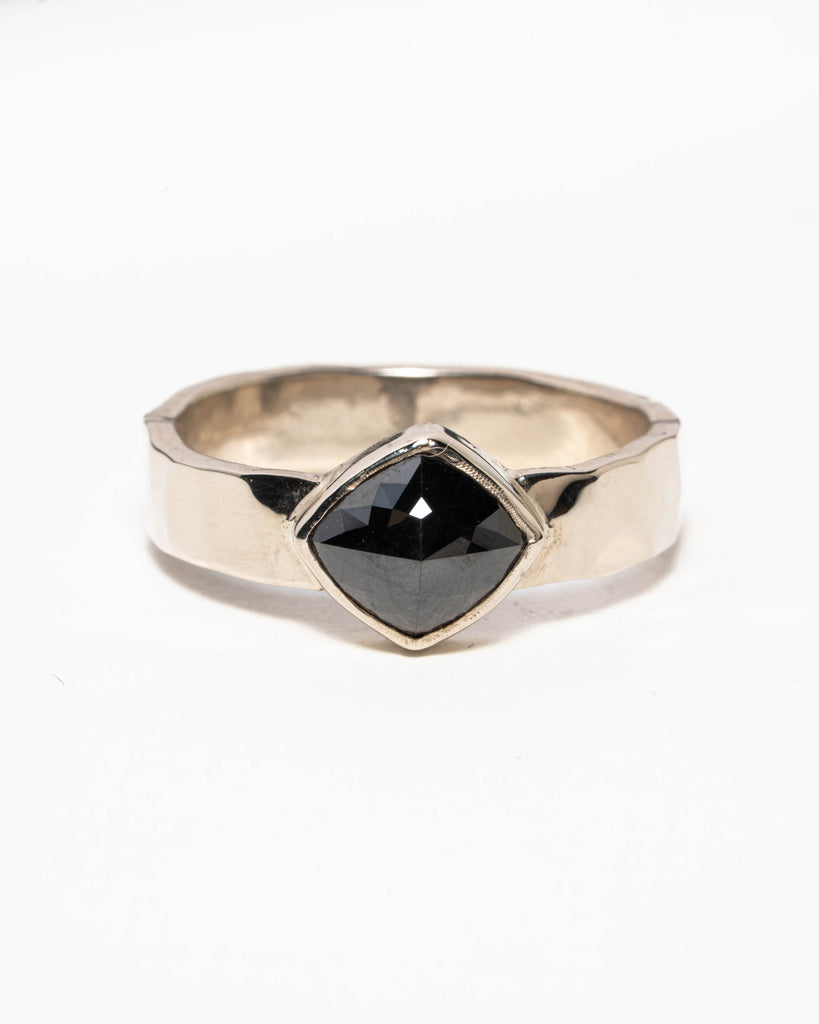 Stoere gehamerde ring gemaakt van 14k witgoud met een bijna zwarte salt and pepper diamant. De ring is een enkelstuk. Heel mooi als verlovingsring voor een man.